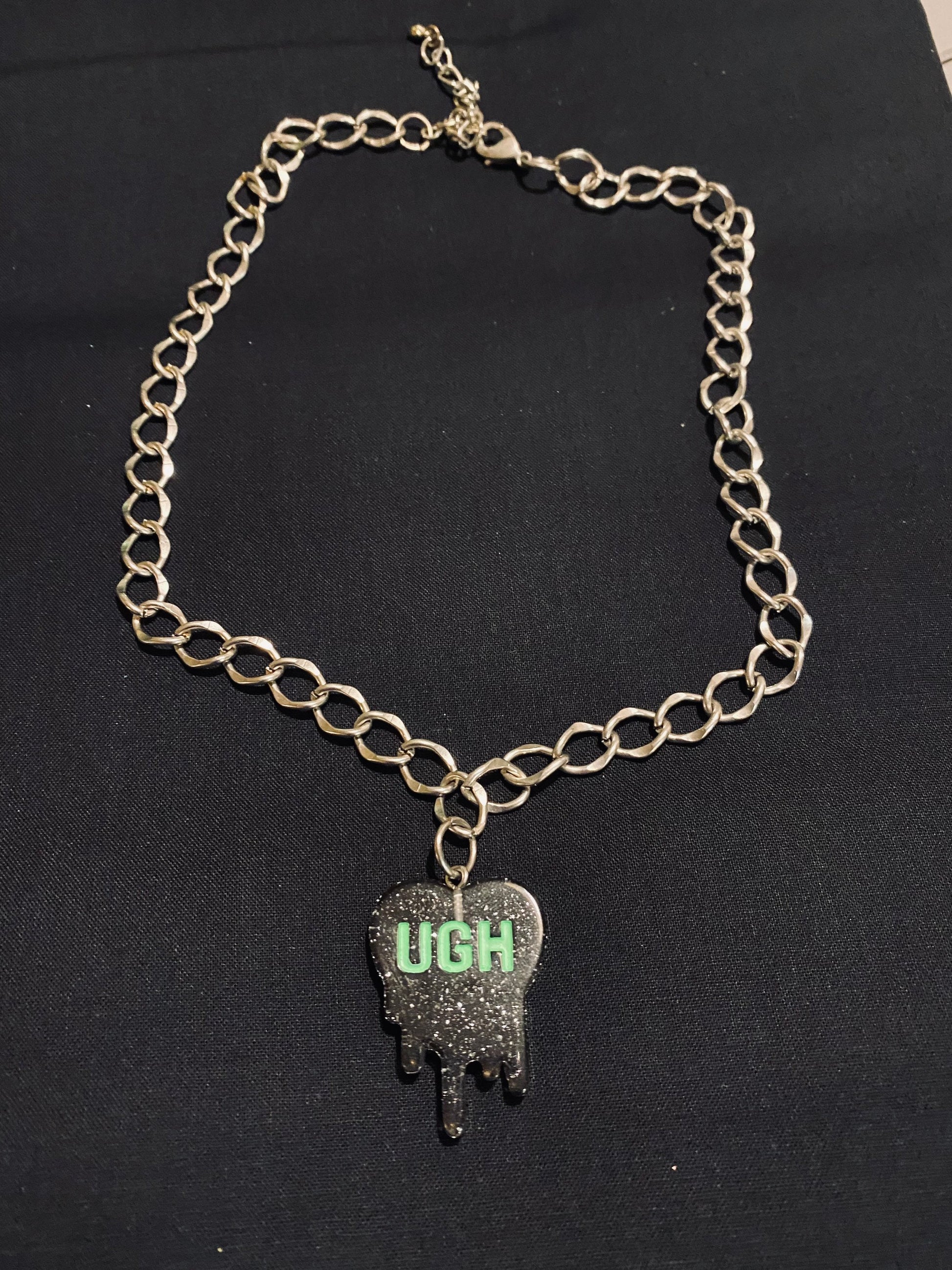 This fun and funky necklace expresses what we are all thinking! On a thick steel lightweight chain, made to be worn close to the neck.