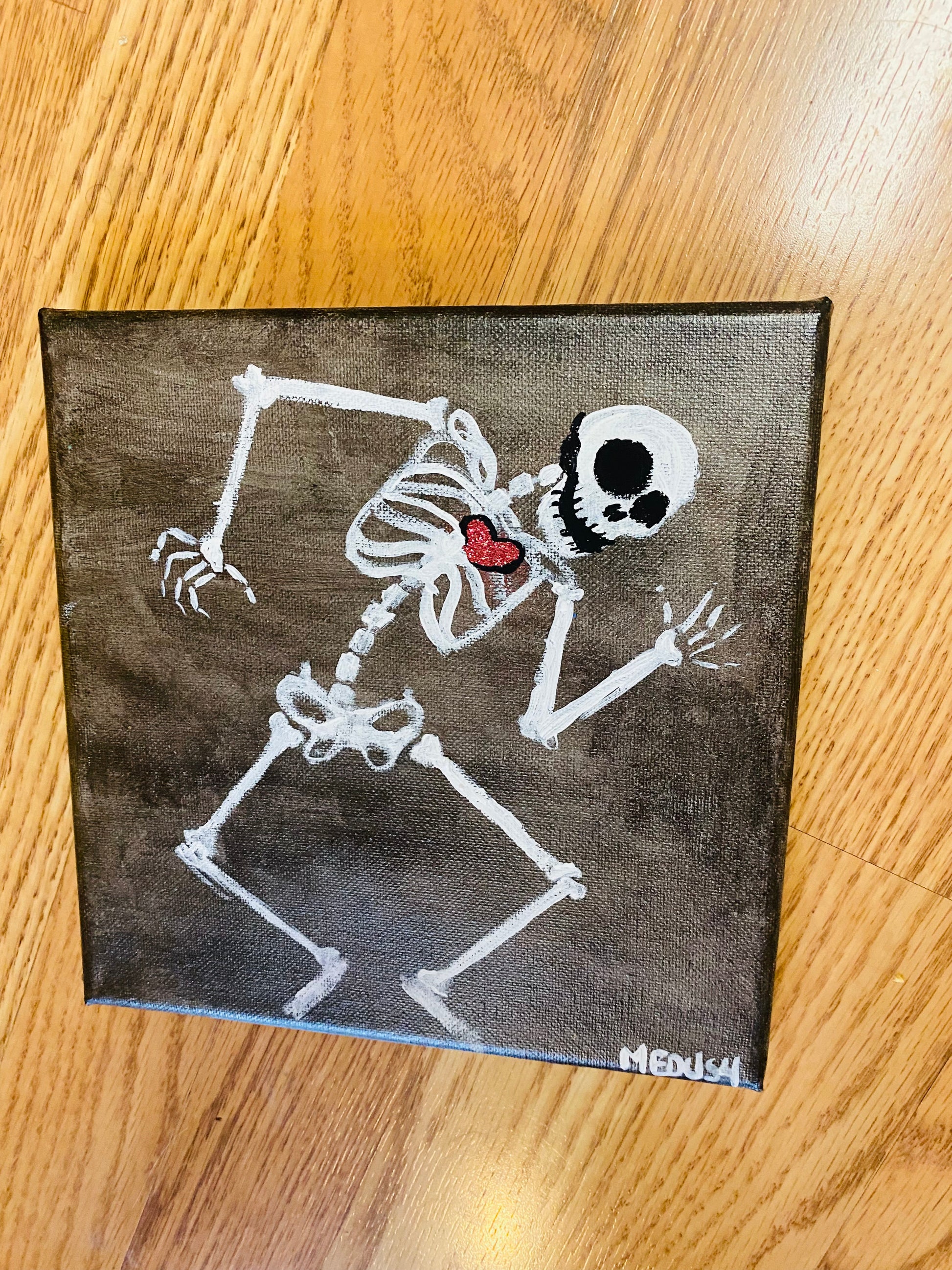 An original acrylic painting signed by the artist, on an 8 inch square canvas. This ready to hang piece featuring a skeleton would make a fun addition to any home or office