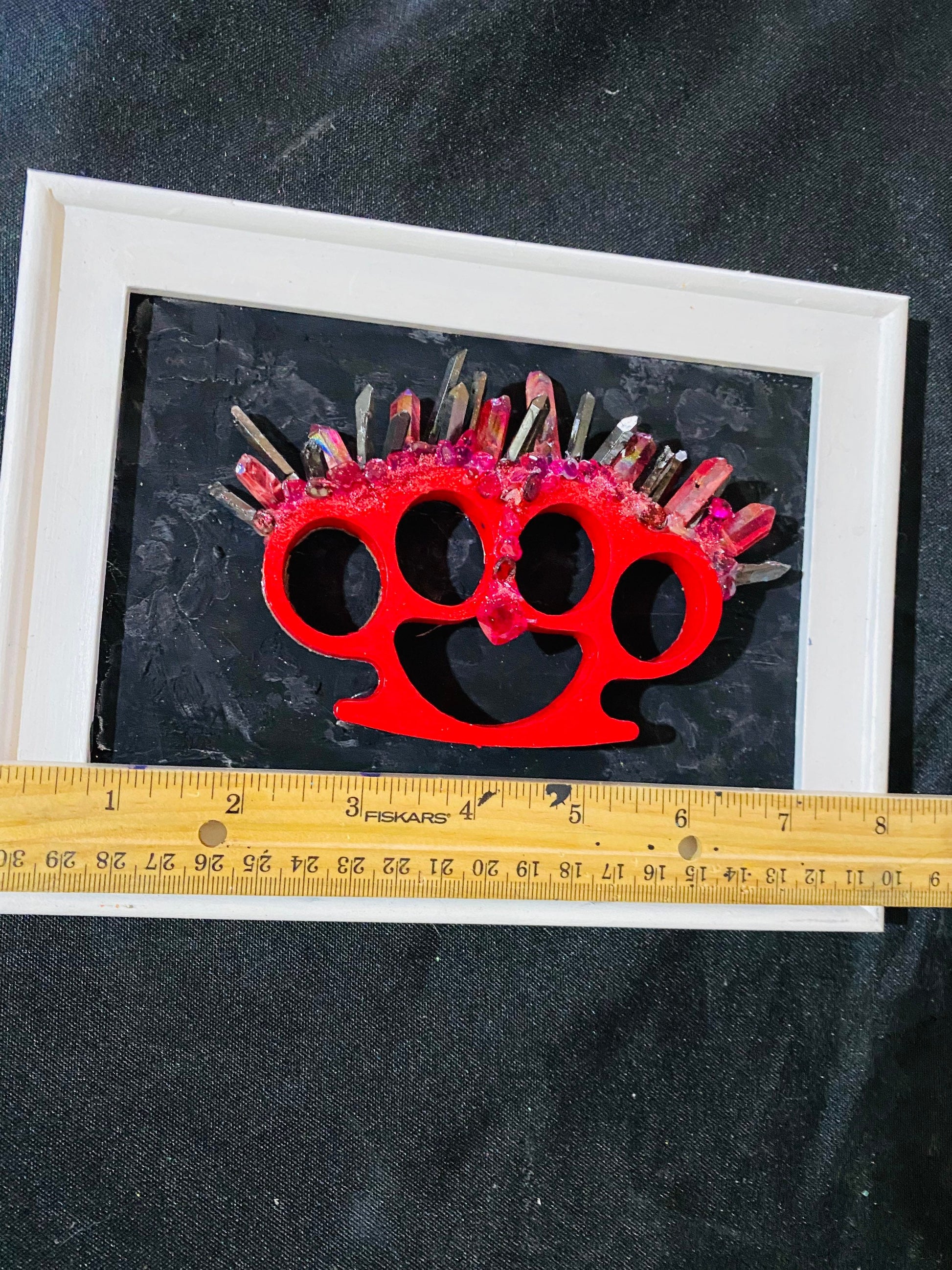Beautiful and Badass- just like you. 3d printed knuckleduster, mounted on a frame, and accented with semi precious stones- both cut and uncut gemstones. Ready to hang.