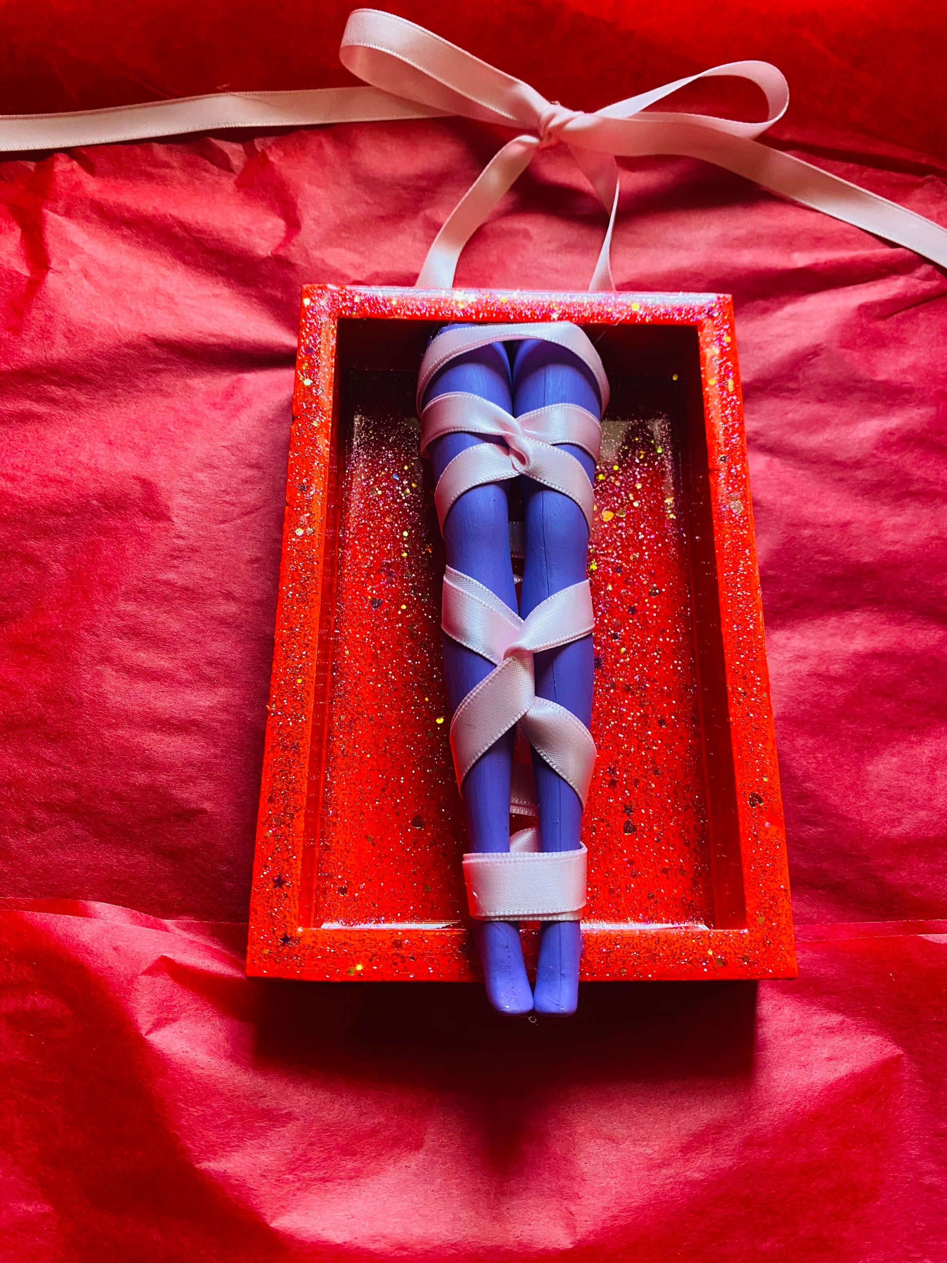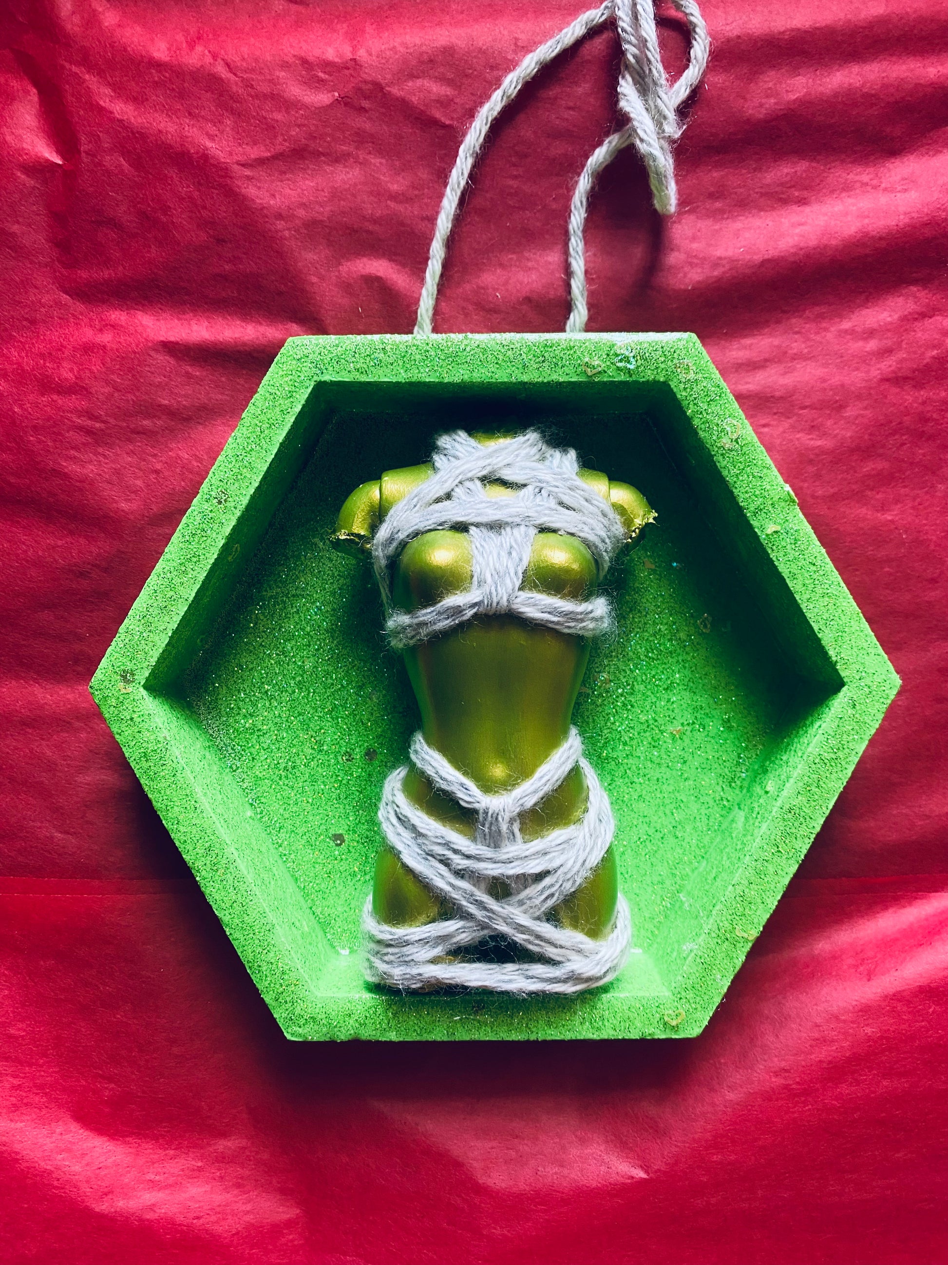 A 4 inch shadow box, ready to hang, with a handpainted and tied Barbie feature- shibari, but Barbie!