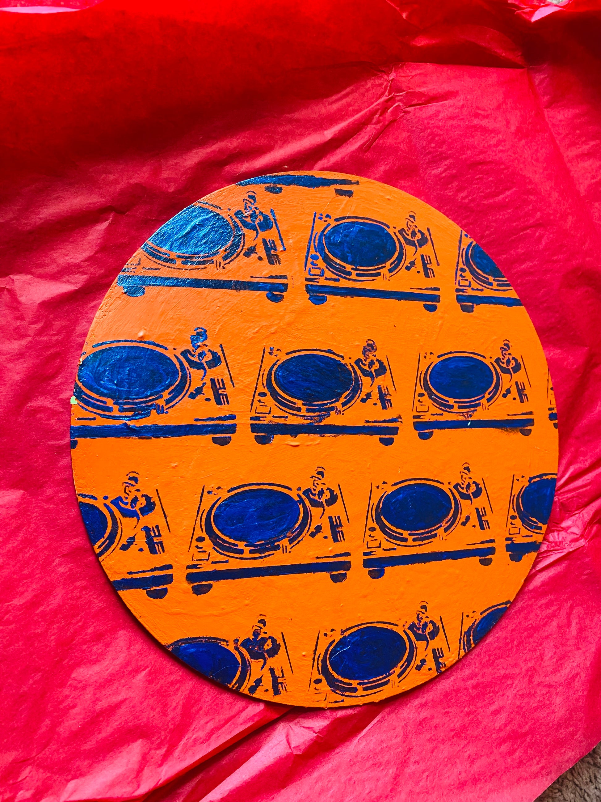 Bright shiny blue turntables on a ready to hang 12 inch wood circle