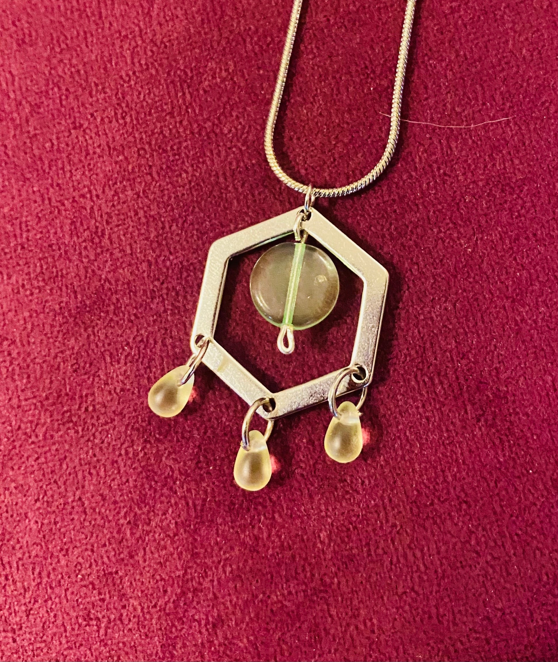 Sliver chain with a silver hexagon, with three matte Vaseline glass drops, and one flat light green circle in the middle! Glows under UV light