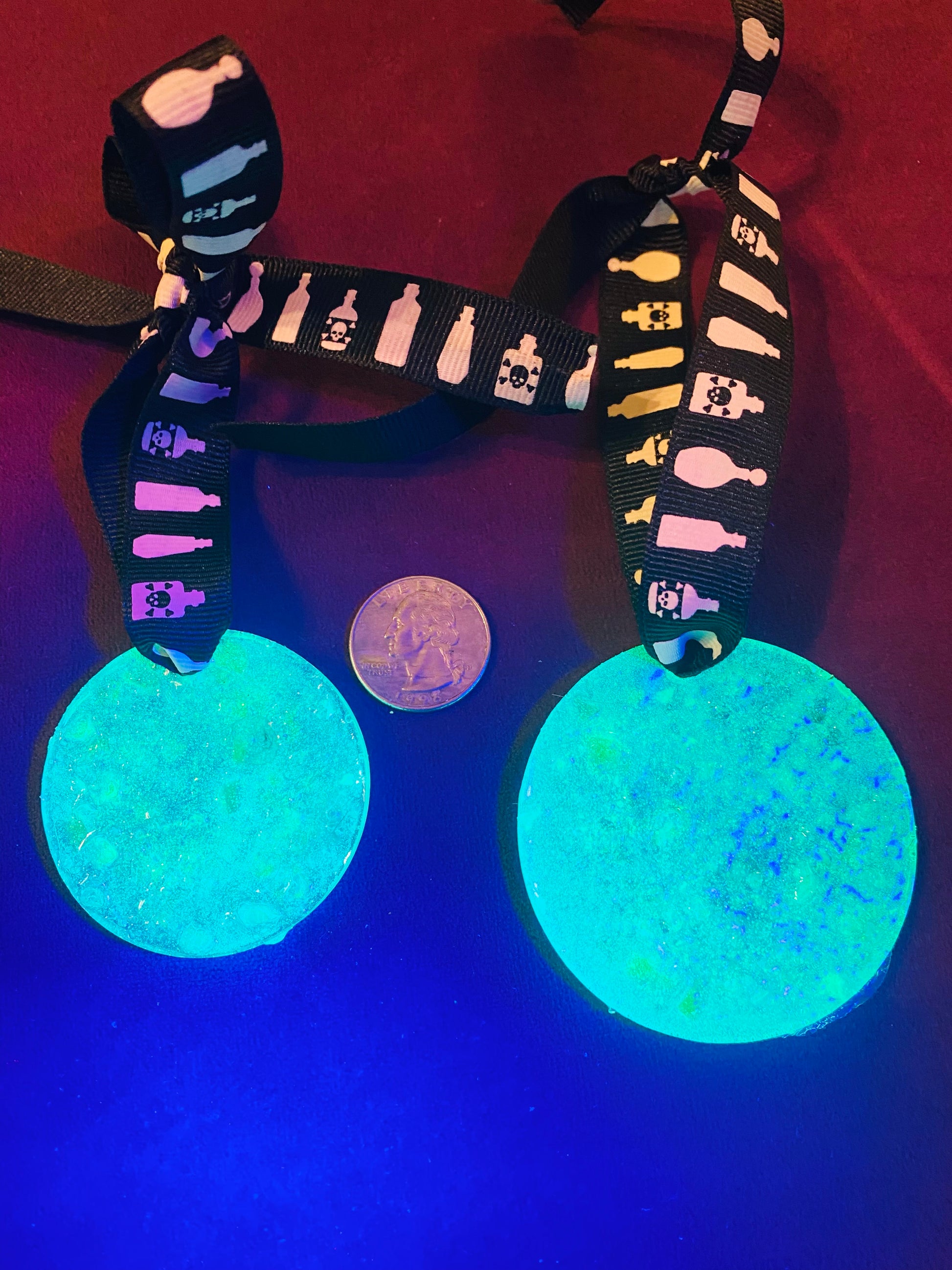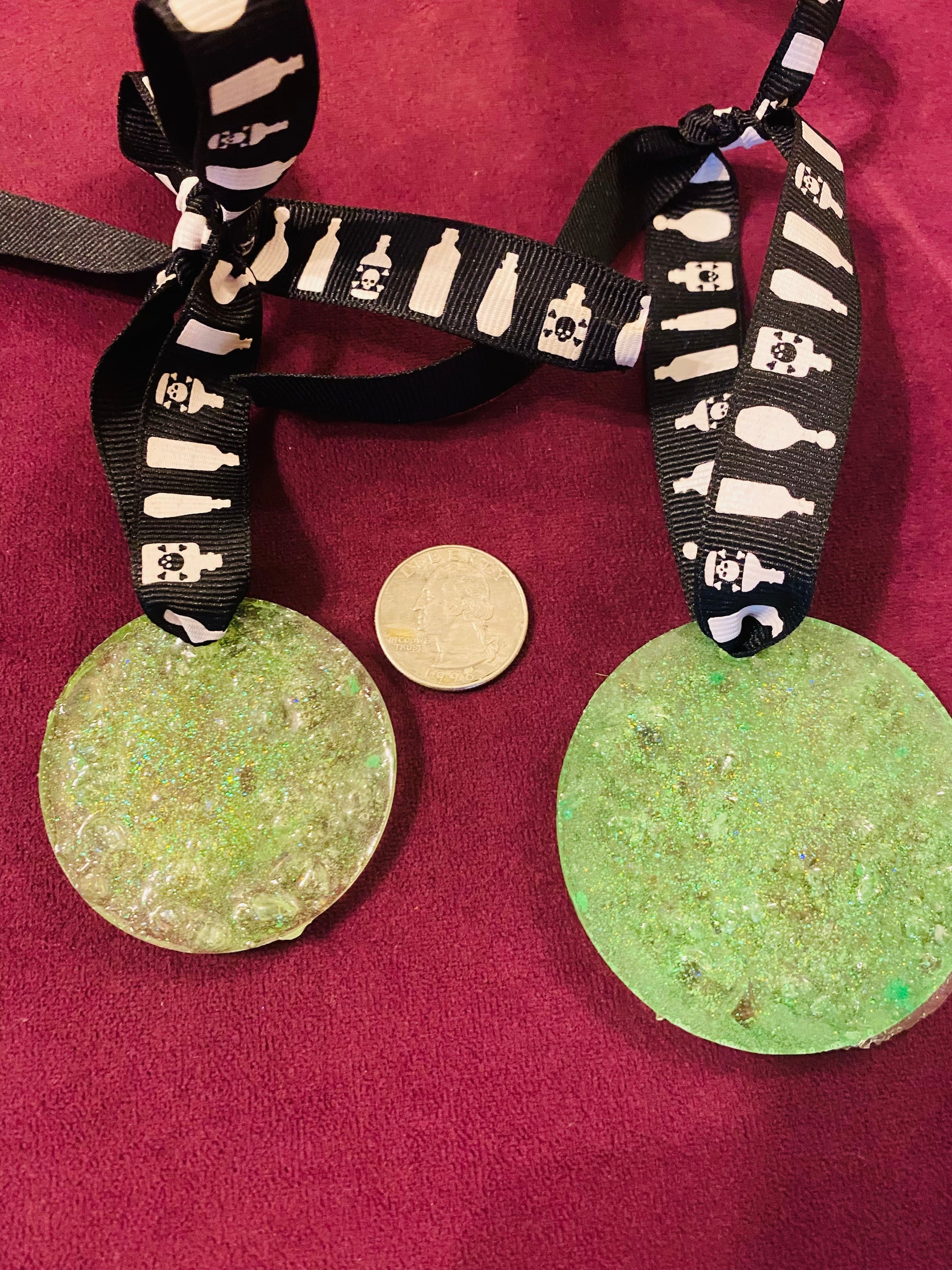 Broken uranium glass pieces encased in resin, accented with a ribbon and perfect for your tree!